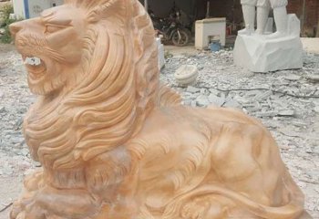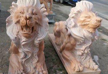 兇猛獅子紅石雕臥著雕塑,為公園景區添彩晚霞之美