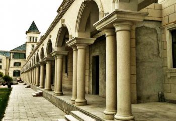 別墅防護羅馬柱雕塑喜用大型燈池,并用富麗的枝形吊燈營建氣氛。門窗上半部多做成圓弧形,并用帶有斑紋的別墅欄桿羅馬柱雕塑勾邊。